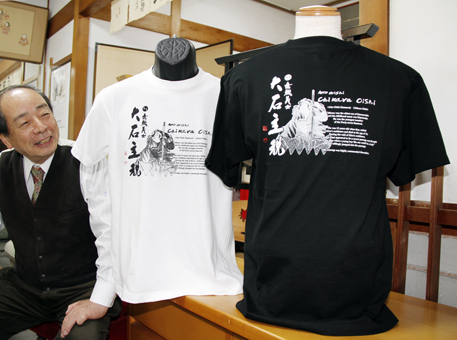 「ハリウッドによる映画化は、若い人たちや外国人に忠臣蔵を知ってもらえる好機」と妻井さん。黒と白の2色があり、サイズはSからLLまで4種類。1枚2750円で販売する。TEL45・1700(工芸呉服きぬや)。