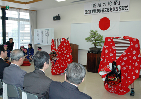 祝賀会には来賓、神社総代ら約80人が出席。「坂越の船渡御祭保存会」の事務局として生浪島堯宮司(68)が指定に至った経緯を紹介。篠原明会長(75)が「名誉ある選定を重大に感じる。後継者育成、木造船の維持管理など課題はあるが、祭りを継続できるように頑張る」と伝統継承に意欲を示した。同神社の子供獅子舞も演舞を披露し、お祝いに華を添えた。