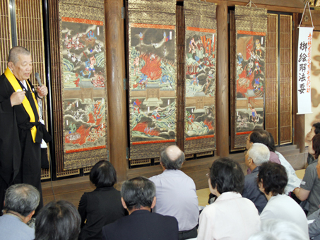 法要では、4点ずつ本堂に展示して霜尾住職が解説を加えた。圧巻は生前に殺生や盗みなどを犯した者が落ちる先を極彩色で描いた「八大地獄」。罪状が重くなるごとに責め苦の過酷さが増すという死後の世界が生々しく表現され、拝観者は住職の説明を神妙な面持ちで聴いていた。