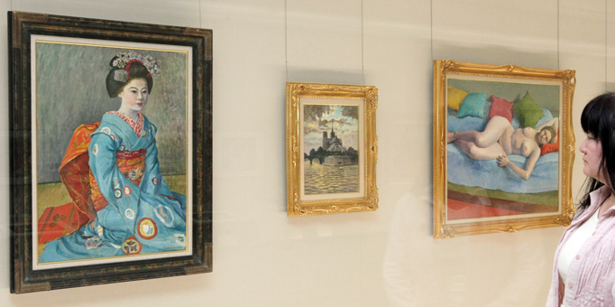 今展では、市が所蔵する林の作品群から、京都の名刹を描いた「西芳寺庭」(縦48センチ、横59センチ)、パリで創作に没頭したころの「ノートルダム逆光」(F6号)など油彩画11点をピックアップ。印象と写実の間を行き来した画風の変遷を見ることができる。夫とともに画業に励んだ妻貞子(1915−73)、爽林会の創設メンバーである米谷朝五郎さん(1921−)や神吉栄治さん(1922−87)ら計7人の約20点も展示する。