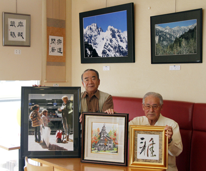子どもの頃から書と絵が得意の土佐善行さん(82)=清水町=とカメラ歴約20年の頭巾嘉廣さん(75)=中浜町=。ジャンルの異なる2人だが、サークルの活動場所が同じ部屋で5年ほど前から仲良くなった。一緒に作品展を開くのは初めて。
