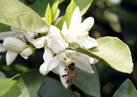 40アールの畑に温州ミカンの「興津」や「宮川」など5品種を栽培する「ひろむらみかん園」。約500本ある果樹に14日ごろから直径4センチほどの白い花が開き始めた。ほのかに漂う甘酸っぱい香りに誘われて、ミツバチがせっせと花粉集めに励んでいる。