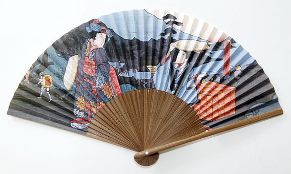 歴史博物館ミュージアムグッズとして平成20年度から毎年一つずつ新柄がリリースされている人気シリーズ。今年の意匠は歌川国貞(三代豊国)が描いた八段目「道行旅路の嫁入」で、小浪と戸無瀬の母子が山科にいる許嫁の大星力弥のもとへ向かう場面を扇子にした。