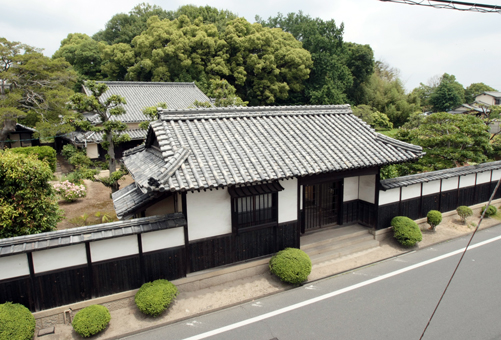 尾崎家住宅は昭和26年に倉敷市に編入合併するまで帯江(おびえ)村だった加須山(かすやま)地区にある。長屋門と白漆喰塀に囲まれた約850坪の敷地に茶室を備えた2階建て主屋、蔵などが建つ。数年前に大学教授が実施した調査で主屋の屋根裏から「大正元年一二月一二日建立 尾崎生三」などと書かれた棟札が見つかった。