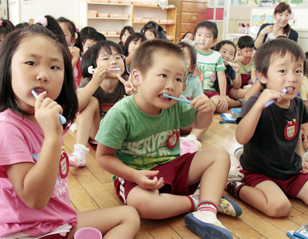 医師と歯科衛生士7人が来園した。年少組は虫歯になる仕組みの話を聞き、年長組は食事に必要な歯の大切さを人形劇で学習。保護者も約60人が別室で虫歯の予防について医師から学んだ。