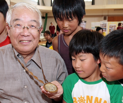 母校の子どもたちに銀メダルを披露する藤本達夫さん