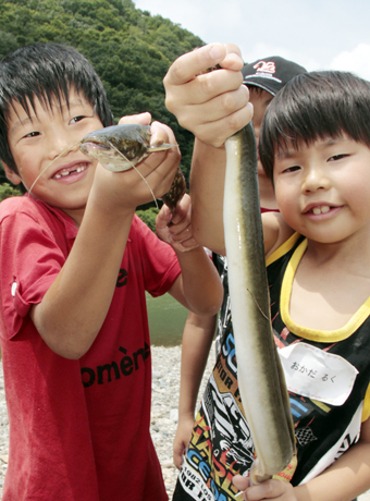 長さ約60センチ、直径約10センチの円筒状の竹かごは一旦ウナギが中へ入ると外に出られない仕組み。子どもたちは近くの土手で捕まえたミミズを中へ入れて川に沈め、安藤さんが2、3日前から別の場所に仕掛けておいた竹かご2個を引き揚げた。