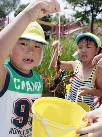 学習カリキュラムは行わないが、各園とも自然観察や保育所園児とのプール交流など地域の環境を活かしたプログラムを準備。塩屋幼稚園では24日、近くの公園の水場でザリガニ釣りを楽しんだ。園児8人が割りばしの先に結んだ凧糸にスルメをくくって水の中へ。ザリガニが食いつくと子どもたちは大喜び。ゆっくり引き上げてバケツへ入れた。