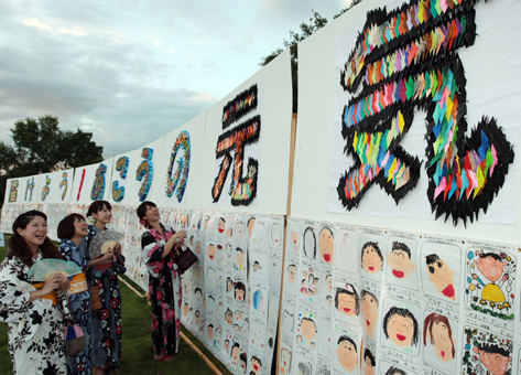 巨大アートは高さ2・8メートル、全長40メートル。色とりどりの折り鶴約2万羽を敷き詰めて文字をかたどった「届けよう!あこうの元気を☆けせんぬまに!!」のスローガンの下に市内園児、児童らの似顔絵約2000枚を並べた。