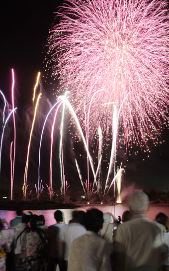 友人3人で来場した看護師の種子由香里さん(24)=若草町=は「河川敷よりも見やすくていい感じ。曲に合わせて打ち上げる花がきれいで印象的でした」と笑顔で帰路についた。