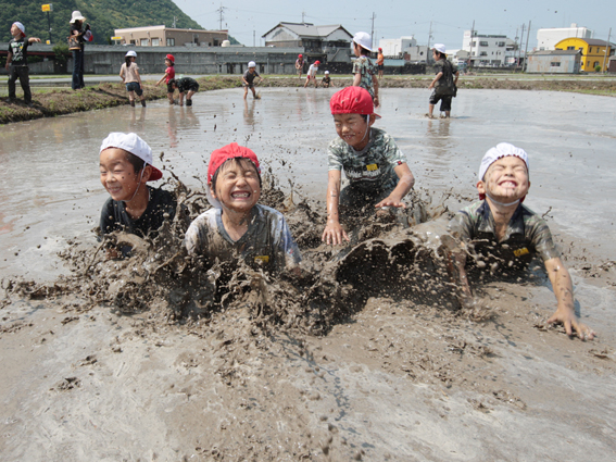 ほとんどの子どもが田んぼに入るのが初めて。柔らかい泥の感触がおもしろくてたまらないようすで、バシャバシャしぶきを上げながら走り回っていた。