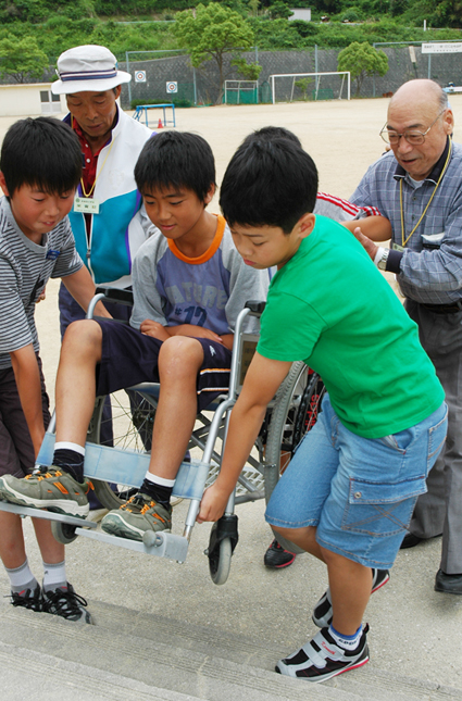 「盲導犬を知ろう」「点字を書いてみよう」など学年別にテーマを設定し、アイマスク歩行や車椅子乗車などを行った。