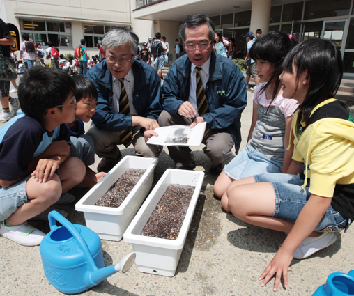 受け取った種をさっそく土にまいた塩屋小6年生の岡田桂汰君(11)は「どんな色になるのかな。みんなで世話をして観察したい」と楽しみにしていた。