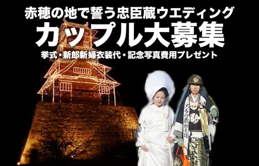 一つは「忠臣蔵ウイーク実行委員会」が12月9日(日)に赤穂城跡一帯で行う「忠臣蔵ウエディング」。白無垢姿の新婦が大手門から花嫁行列。大石内蔵助の討ち入り装束をまとった新郎と赤穂大石神社で式を挙げる。二の丸庭園を屋形船で遊覧した後、本丸内で天守閣イルミネーションを背景に記念撮影するプラン。