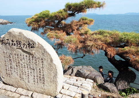「大石名残の松」の正面で民宿を営む大田篤志(とくし)さん(89)・静子さん(89)の話では、現在のマツは約50年前に枯れた先代の後継として3本植えたうちの一本。十数年前にも松枯れを起こして市が伐倒を計画したが、奇跡的によみがえったという。
