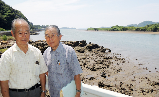 「日野七族」が上陸したと伝えられる相浦川河口部を案内する田渕信幸さん(右)と澤正明さん