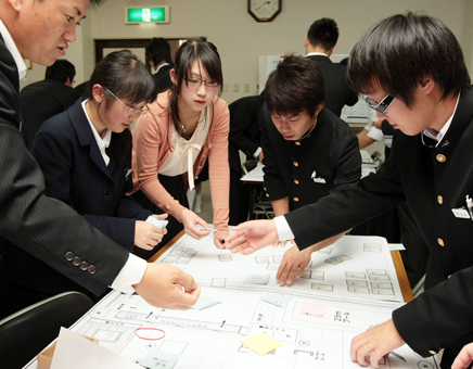 東海地震に備えて静岡県が平成19年度に開発したカードゲーム形式のプログラム。校舎の間取りをプリントした平面図を「避難所」に見立て、被災者約200人の迅速かつ適切な収容を目指す。市の避難所に指定されている同校へ赤穂青年会議所(JC・山本昌紀理事長)がキットを提供し、希望した生徒が参加。JC会員を交えた6人一組に班分けして体験した。