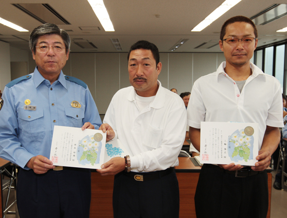 岡田正則署長から県知事名の表彰状を伝達され、「こんな大事になるとは思わなかった」と岡本さんと三輪さん。「3歳とは思えないぐらいしっかりした子だった。元気にすくすく育って強い男の子になって」と話していた。