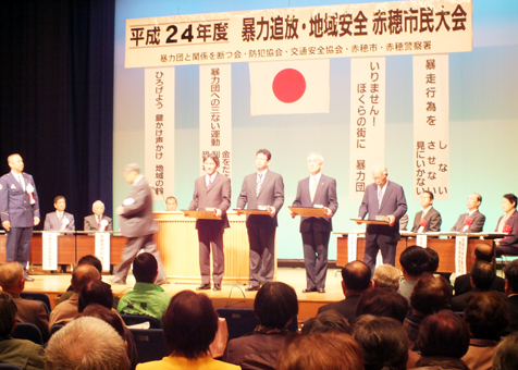 赤穂市においては平成4年に創設された「暴力団と関係を断つ会」が今年で20周年。県暴追組織地域連絡協の会長にこのほど着任した藤野高之会長は「根を断たなければ解決できない。行政と市民がともに戦う姿勢を見せ、暴力団に資金提供しない環境づくりを」と呼び掛けた。赤穂警察署の西野秀夫署長は「暴力団は潜在化、巧妙化しており、赤穂でも監視の目を緩めてはならない。再び組事務所が来ることのないように署員一丸となり先頭に立ってやっていく」と決意を表した。