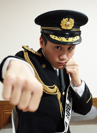 チャンピオンは前週に行われたタイトル戦で3度目の防衛に成功したばかり。引き締まった体に制服を着用し、「軽快なフットワークでパトロール強化し、事件事故の発生をKOして」と署員約50人を前に訓示した。