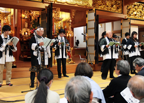 大石内蔵助役を任された加里屋の金礪正和さん(59)は重厚なボイスで聴衆を魅了。「緻密で大胆、忍耐強い内蔵助を表現したかった。楽しい仲間と舞台を作ることができ、充実感でいっぱい」とほおを緩ませた。2日間とも来場した尾崎の児島正幸さん(62)は「目を閉じて耳を傾けると、情景がまぶたに浮かんだ。テレビや映画とはひと味違う忠臣蔵が楽しめました」と出演者へ拍手を送っていた。