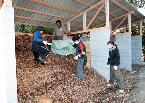 知的障害や精神障害のある人たちの就労機会は内職など屋内業務が多い。施設職員の話では「屋外で外部の人とともに作業することは利用者にとって新鮮。いつもより表情が生き生きしている」という。この半月で約30立方メートル分の落ち葉を収集。ブロック塀で仕切った屋根付きの施設(間口約8メートル、奥行き約3・5メートル)に堆積して発酵を促している。半年ほどで腐葉土になる見込みで、学内の花壇に活用するほか、市民への提供も考えている。