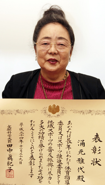 涌元さんは昭和63年から赤穂市の体育指導委員(現スポーツ推進委員)を務め、市民スポーツの普及に尽くしてきた。この間、県委員会の代表理事なども歴任。3年前には全国体育指導委員連合から功労者表彰を受けた。