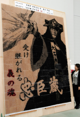 赤穂中学校(西川祐二校長)の1年生125人が「魂〜受け継がれる思いを胸に〜」をテーマに共同制作した力作。11月の文化祭と「赤穂シティマラソン」の会場で展示し、好評だったため、義士祭前から同会館に飾っている。「赤穂中1年生の義の魂を感じてください」と同校。展示は1月14日(月・祝)まで。30日〜1月4日と火曜日は休館。