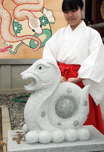 御影石製で高さ約45センチ。尾に大きな宝玉を巻いた縁起のよい姿で、飯尾宮司は「巳は古来より神様の使い。縁結びや子宝祈願にご利益があるとされるので、ぜひお参りしてください」と話している。