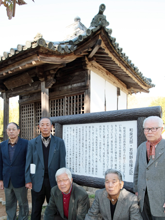 案内板(高さ約1・7メートル、横約1・5メートル)は、「相生歴史研究会」(月岡定康会長)と地元自治会などが合同で設置。昭和27年に浅野陣屋跡に移築された薬師堂のそばに建てた。今月3日に行われた除幕式には関係者と地域住民の約30人が参加。子どもを残してこの世を去った小式部を悼んだ式部の和歌「とどめおきて誰をあはれと思ふらむ子はまさるらむ子はまさりけり」を吟詠し、ゆかりの歌人を偲んだ。