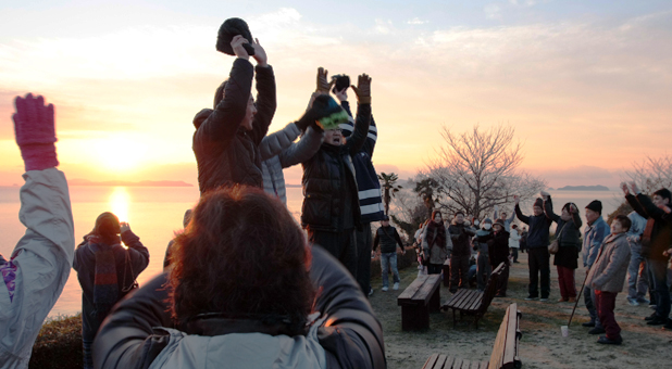 日の出予想時刻が近づくにつれて東の空が赤みを増し、7時20分ごろ、水平線上にたなびく細長い雲の上にまばゆい太陽が登場。集まった人たちはカメラや携帯電話で景色を撮影したり、目を閉じて合掌したりしていた。