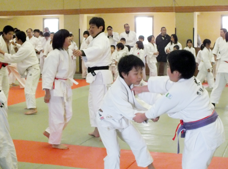 かかり稽古では社会人が小学生に胸を貸すなど世代を超えて組み合った。今年還暦を迎える長池町の公務員、鹿島勝己さん(59)は「演武始めはみんなの元気な顔を見るのが楽しみ。今年も気持ちが引き締まった」と話した。