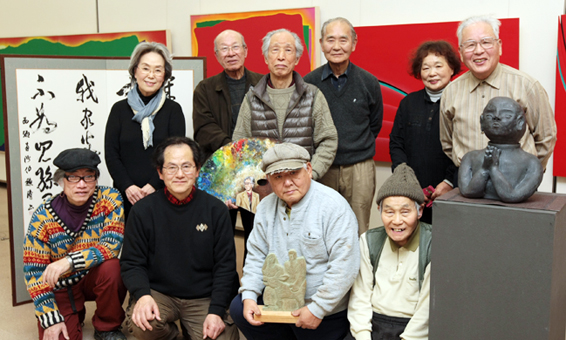 ハーモニーホール展示室で作品展を開催中の「群象の会」のみなさん