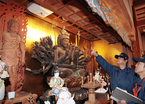 国指定有形文化財の「木造千手観音坐像」がある尾崎の普門寺は査察団4人が訪れ、藤本恵祐住職の立ち会いの下、法令に基づく消火器具や警報装置などが適正に維持管理されているかチェックした。