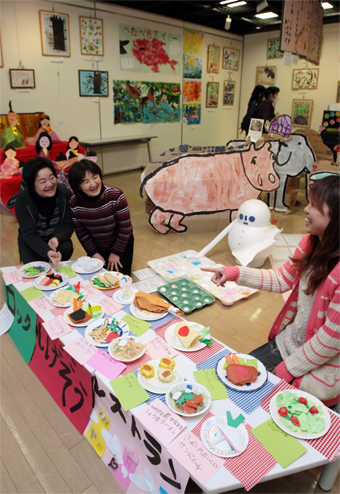 各校の特別支援学級の児童、生徒70人が一年間の総まとめとして絵画、工作、版画などを出品している。俳句の短冊を枝にかけたツリー状のオブジェ、ちりめん布の木目込み壁掛け、絞り染めのハンカチなど約200点。ユニークな発想と元気のあふれる作品が目を引く。