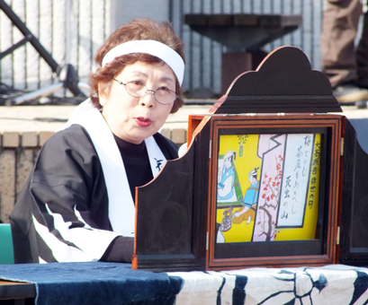 赤穂義士と松山藩の関わりを描いた紙芝居を読み上げる永井信子さん
