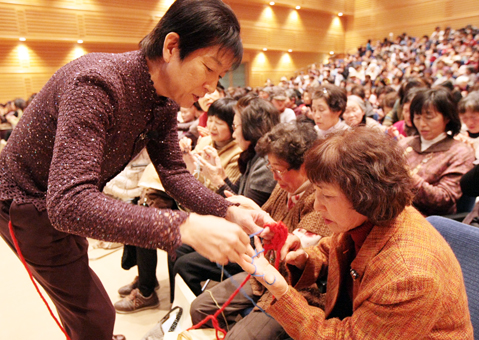 講師の広瀬光治さんから直接手ほどきを受けた指編み講習