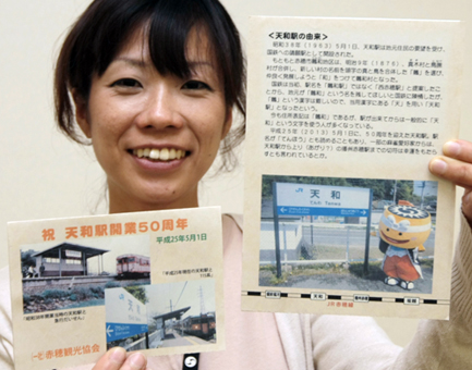 乗車券付き記念台紙はA5判二つ折りで駅名由来の説明文や開業当時の写真などをカラー印刷。1セット180円で、記念列車の到着と同時に午前9時38分から限定50セットを発売する。TEL42・2602(観光案内所)。