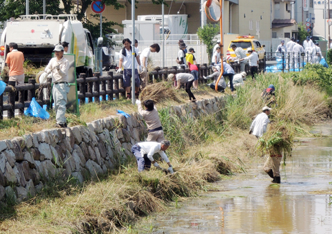 土手や水面に落ちている空き缶やビニール袋を回収。川岸やガードレール沿いで高さ1メートルほどに伸びた草を刈払い機や鎌で刈り取った。約2時間の作業でさっぱりと景観を整えた。