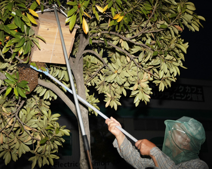 街路樹で集団化したミツバチを捕獲する西村武夫さん