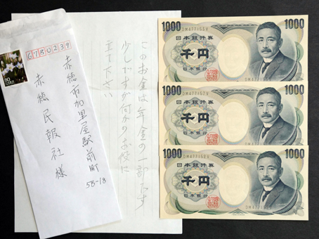 「このお金は年金の一部です。少しですが何かのお役に立てて下さい」と書かれた便せんと新札の1000円札が3枚。筆跡から例年と同じ送り主であることは間違いない。紙幣は夏目漱石の肖像画が印刷された一世代前のものだった。
