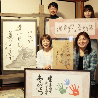 日本書芸院の一科審査員で、塩屋で書道教室を主宰する黒田素波さん(50)と弟子の塩田素風さん(51)=城西町=、大賀香優さん(44)=砂子=、小林清泉さん(40)=相生市佐方=。中央の公募展を主な発表の場とし、地元での作品展は今回が初めて。「日々の生活の中で心に感じたことを作品に」と型にとらわれない自由な創作を心がけた。