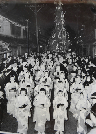 昭和33年の曳きとんど。子どもから大人まで多くの住民が参加した様子がうかがえる=佐方直陽さん提供=