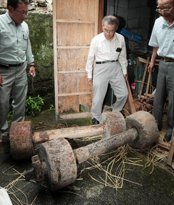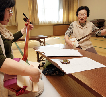 同じ坂越地区で昨年11月、海に浮かべた組み立て式舞台で芸能を披露する「船だんじり」が64年ぶりに上演され、「鳥井の曳きとんども」と復活の機運が一気に高まった。船だんじりの再演にも関わった宮崎素一・有年考古館長(62)が発破をかけ、年明けから自治会の役員会で計画案を検討。また、通常は口承で行う和楽器の稽古をスムーズにしようと、囃子方として過去4度の参加経験がある佐方さよ子さん(77)が楽譜作りに着手した。4月から始めた採譜には、三味線歴37年の牟禮清美さん(66)=坂越=が協力。「耳と体で覚えている」という佐方さんの演奏と過去の録音テープを元に牟禮さんが音程を書き取った。