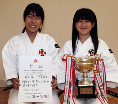 県高校総体の女子単独演武で上位を独占した長崎ひな選手(右)と下脇真歩選手
