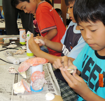 あいにくの雨天で海岸清掃は行わず、海岸近くの集会所「東之町倶楽部」で主催者が用意した漂着物を材料に工作。7色に光る円筒形のLEDランプ(高さ約15センチ、直径約5センチ)を土台にサザエ、カキ、サクラガイなどを接着剤で貼り付け、亀や魚など自由な造形と装飾を楽しんだ。