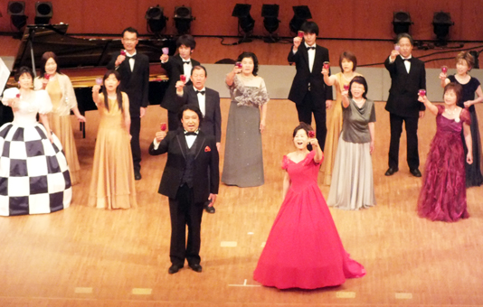 「バロックオペラからミュージカルまで」をテーマにした後半は、声楽専攻の会員が「フィガロの結婚」「オペラ座の怪人」などから約20曲を歌った。最後はオペレッタ「こうもり」の「乾杯の歌」。出演者全員がワイングラスを手に合唱する演出で華やかに締めくくった。