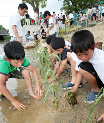 ビオトープは学校運動場に隣接する右岸側の法面に整備され、面積約200平方メートル。地元産の花崗岩を配し、コナラ、ネコヤナギなどの落葉樹を植栽した。この日は、工事を担当する光都土木事務所が加里屋川で採取した草、ドジョウ、オタマジャクシなどを児童約80人が水辺で移植、放流した。