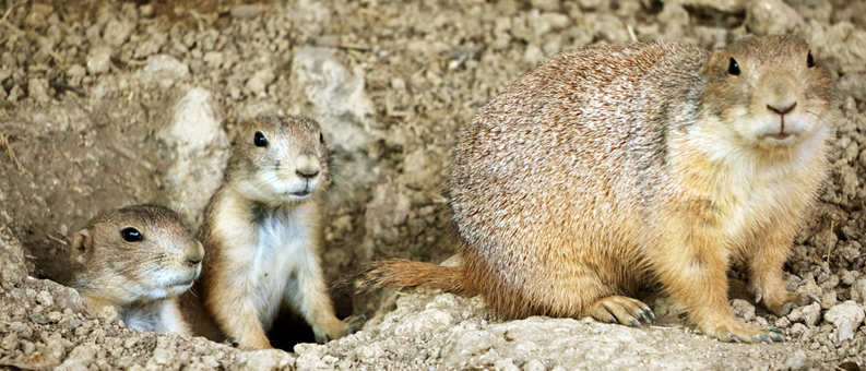 プレーリードッグは北米の草原に住むリス科の動物。土中にトンネル状の巣を作り、群れで生活する。臆病な性格のため、巣穴に隠れていることが多い。