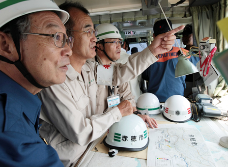 加里屋の赤穂港で巡視艇「ぬのびき」(橋本康之船長、乗組員10人、125トン)に乗り込み、坂越沖と西浜沖を折り返す約13マイル(約21キロ)を1時間半ほどかけて巡航。海図と照合しながら防潮堤や岸壁を確認した。